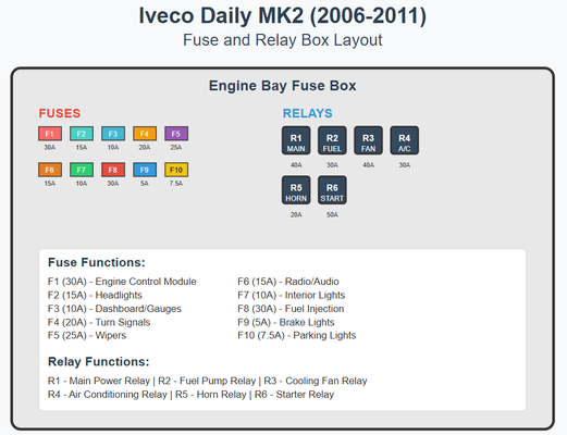 Detailed fuse and relay diagrams for the Iveco Daily MK2 commercial vehicle (2006-2011). Professional diagnostic information for quick troubleshooting of electrical faults.